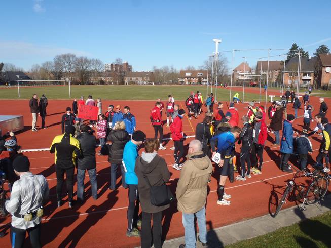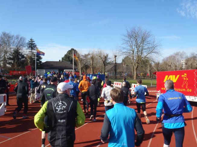 Jahnsportplatz Husum 12.01 Uhr / Kilometer 0,2 Nach einer halben Runde auf der Bahn ging es raus aus dem Stadion. |