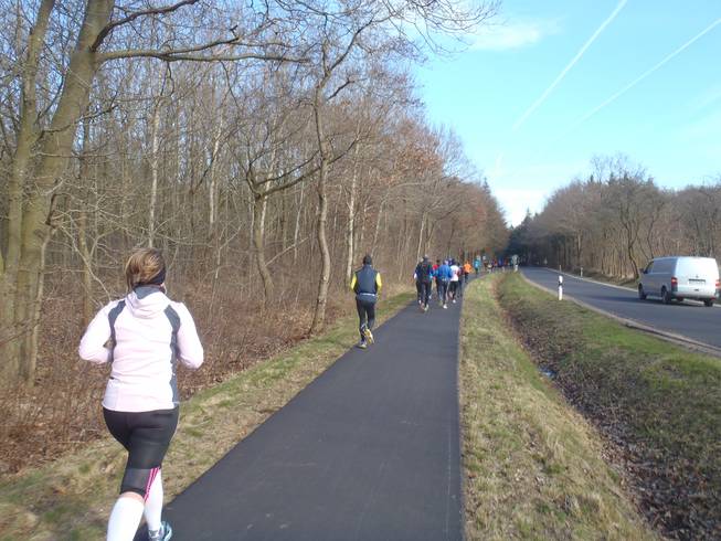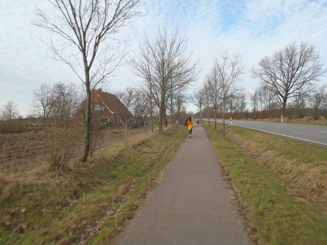L273 Hauptstraße Kurz vor Horstedt 15.16 Uhr / Kilometer 36,0 Hier traf ich nach einiger Zeit doch noch wieder ein paar Mitläufer. Lange hatte ich keine Freude an der Gesellschaft, denn auch hier zu ich schnell weiter. Bei dem Tempo konnte ich auch noch die 3:52 Stunden und damit die 5:30 Min/Km-Marke knacken. |