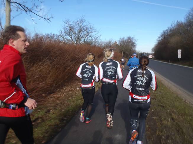 L273 Hauptstraße 12.29 Uhr / Kilometer 5,0 Diese drei Damen hier waren wichtig. Die liefen nämlich für den Fri Ööwingsfloose e.V. und deren Fans fuhren ständig von Kilometer zu Kilometer und warten auf ihre Läuferinnen. Und so lange ich nur knapp davor lag (ich überholte kurz nach dem Foto), bekam auch ich die Anfeuerungen ab. |
