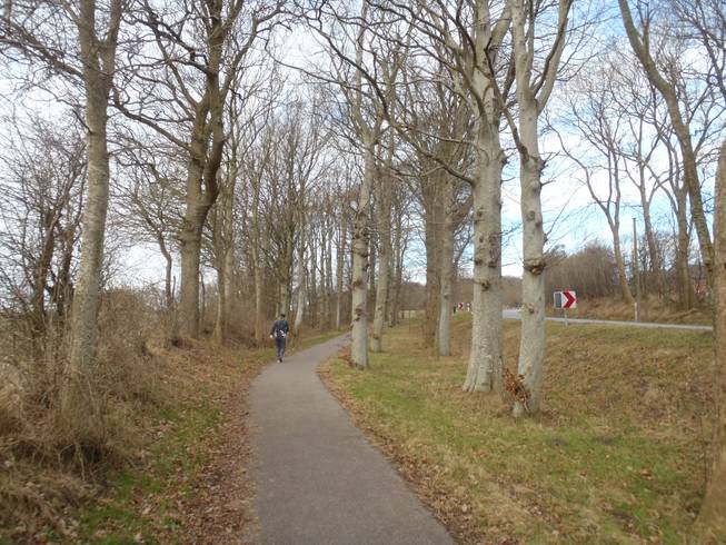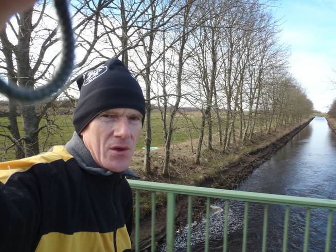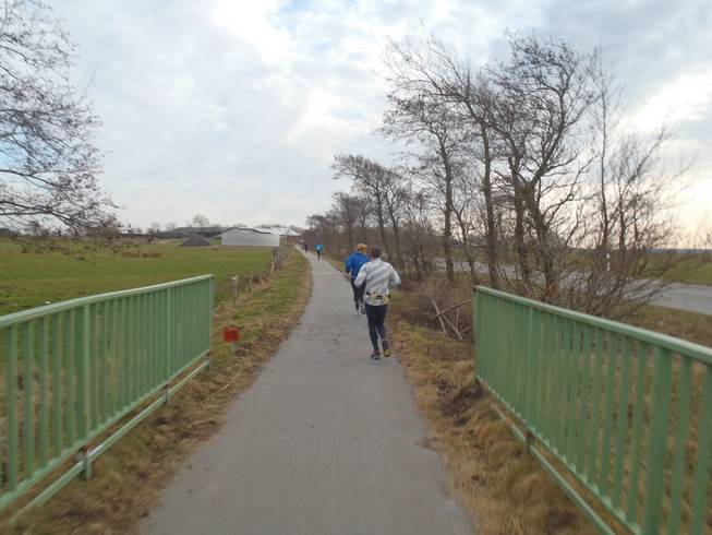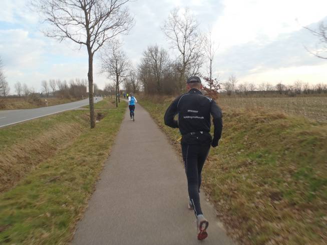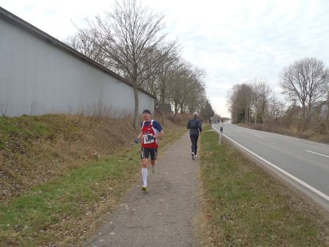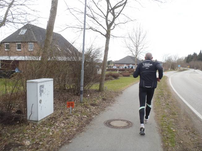 L28 Drelsdorfer Straße 14.04 Uhr / Kilometer 23,0 Gleich am Ortsausgang von Breklum wurde es bitter. Eine sehr lang gezogene Steigung und der Wind heftig von vorne. Da wurde aus Laufen fast Gehen. Das tat in den Beinen weh. |
