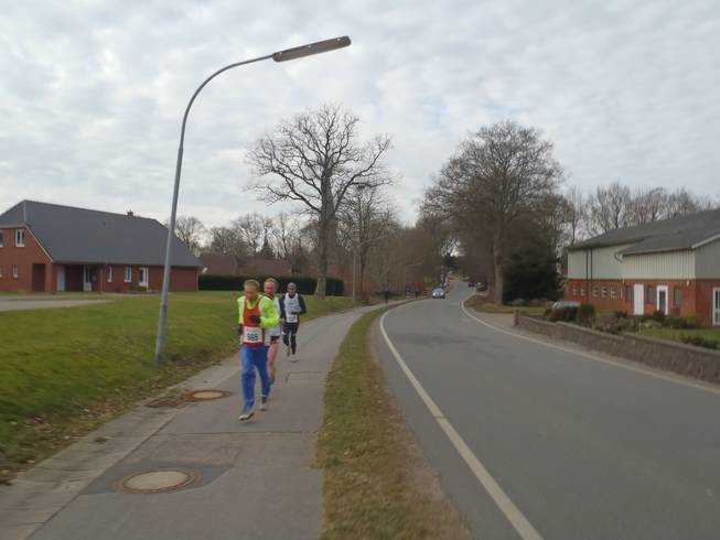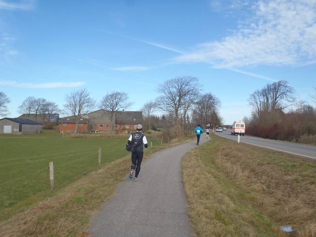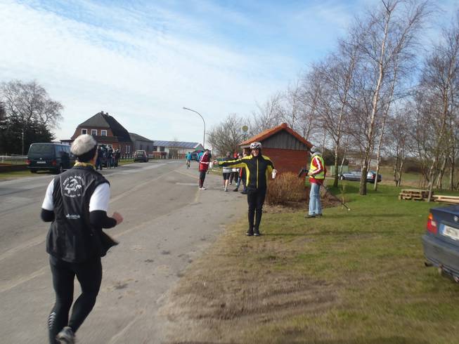 L28 Drelsdorfer Straße Breklum 13.45 Uhr / Kilometer 19,0 Nun kamen mir vermehrt Läufer entgegen. Die hatten die Wende schon geschafft und waren auf dem Weg zurück. |
