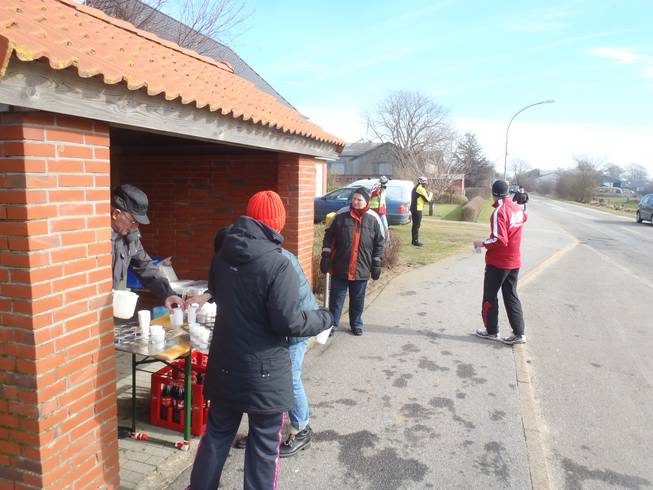 K66 Dorfstraße Ahrenshöft 12.53 Uhr / Kilometer 9,9 Verpflegungsstellen gab es sieben. Also vier Stellen, von denen man drei sowohl auf dem Hin- als auch Rückweg passierte. Hier wurde einfach die Bushalte-stelle umfunktioniert. |