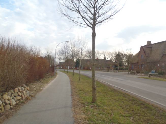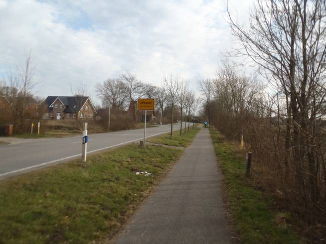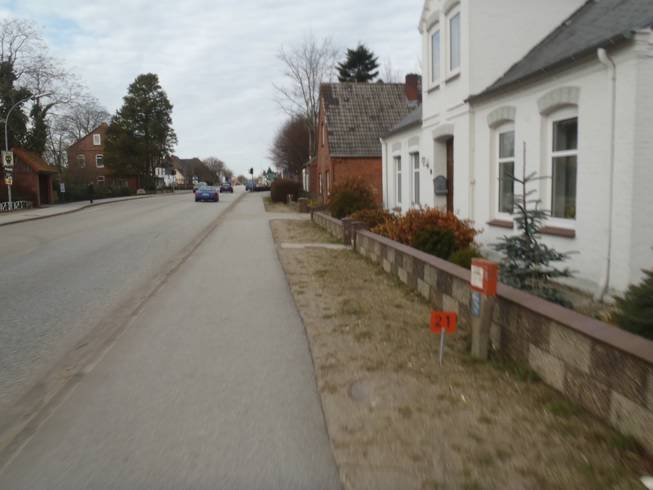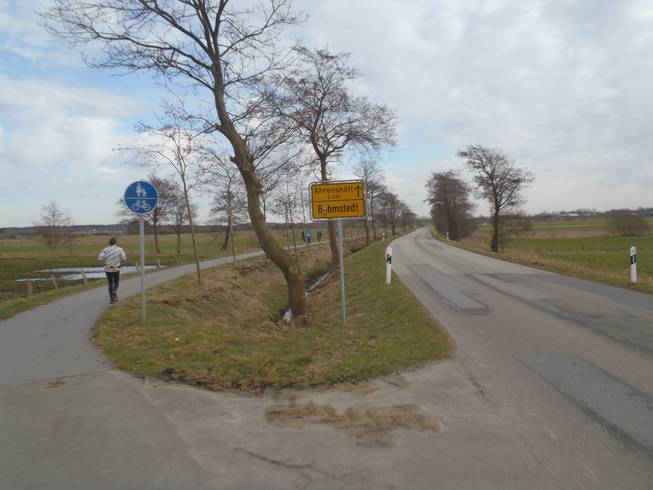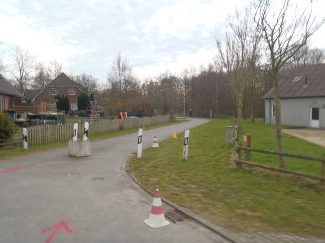 Bachweg / Eikammsweg Breklum 13.51 Uhr / Kilometer 20,5 Nun ging es in die Schleife durch Breklum. Das war prima ausgeschildert und auf die Straße gemalt. |
