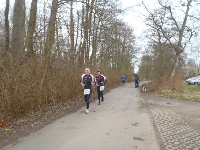 Eikammsweg Breklum 13.56 Uhr / Kilometer 21,3 Hier kamen mit die drei Damen vom Fri Ööwingsfloose e.V. entgegen. Man rief mir noch zu, mich bald wieder eingeholt zu haben. Da lag sie ungefähr fünf Minuten zurück. Im Ziel sollten es 26 Minuten sein. |