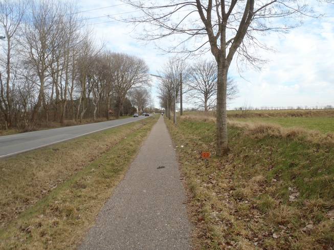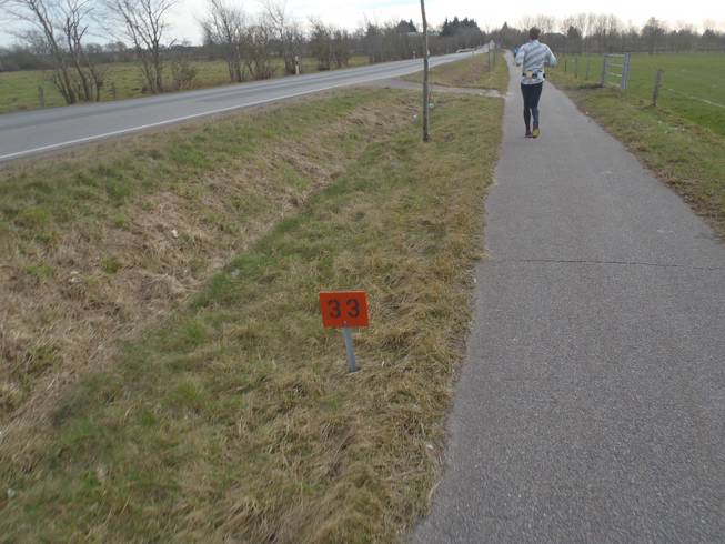 L28 Drelsdorfer Straße Breklum 14.01 Uhr / Kilometer 22,5 Und nun ging es zurück. Den Km 22 hatte ich bei 1:57:40 Stunden passiert. Der stand wohl falsch. Aber irgendwie lag ich gut in meinem Plan. Der Kurs insgesamt war übrigens korrekt vermessen und die anderen Kilometer-Schilder standen gut. |