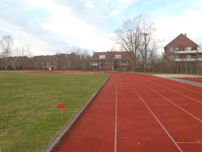 Erichsenweg Husum 15.45 Uhr / Kilometer 41,7 Da lag es vor mir, der Jahnsportplatz. Und direkt hinter den Bäumen konnte man schon das Ziel sehen. Allerdings galt es noch, eine Runde auf der Bahn zu drehen. |