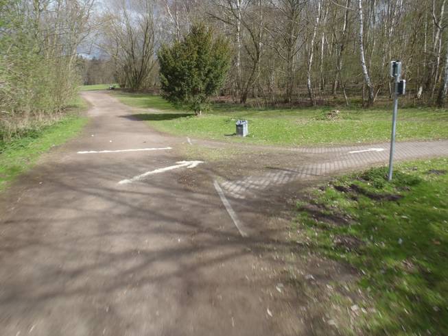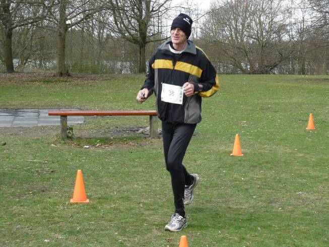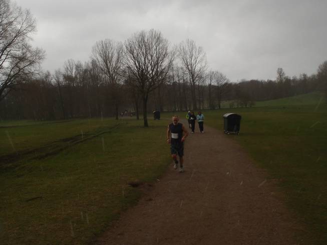 Runde 1 / Kilometer 4,5 9.26 Uhr Immerhin... kurz danach wurde es schon wieder heller und der Hagel war vorbei. Dafür war nun die Strecke etwas naß. Runde 1 inklusive Pendel-stück in 24:59 Minuten. Das paßte. |