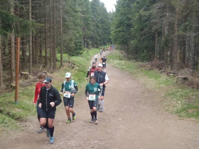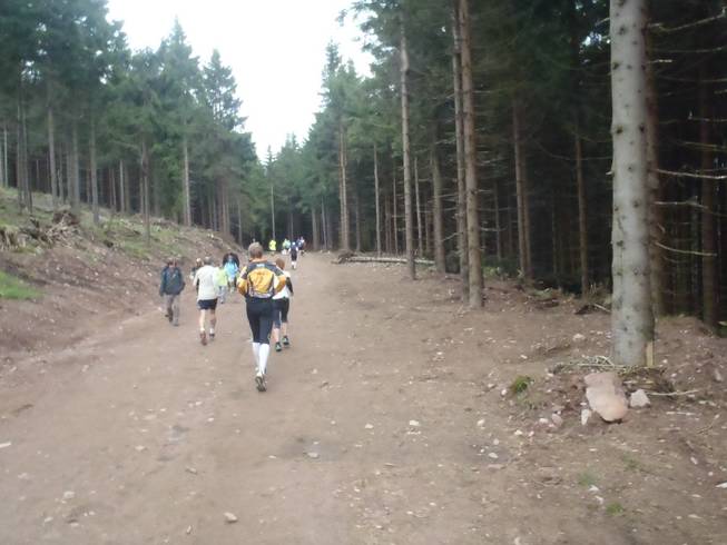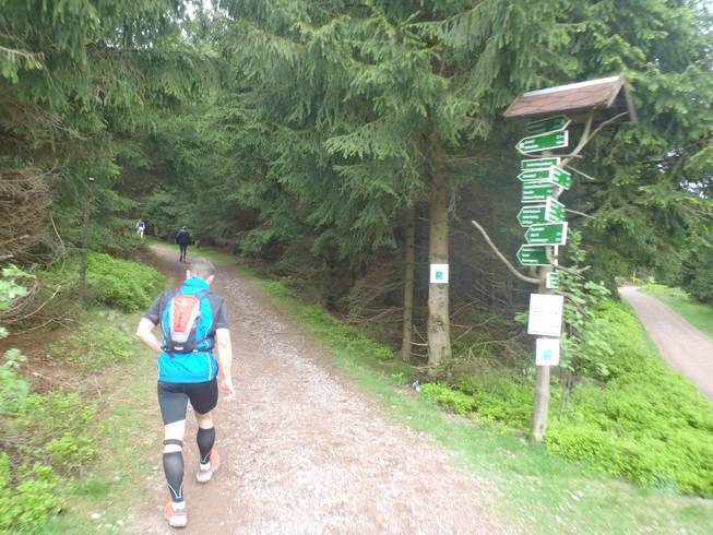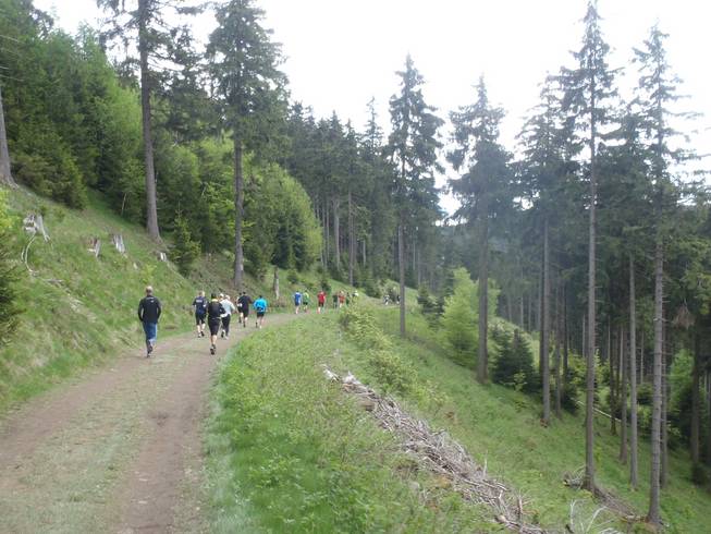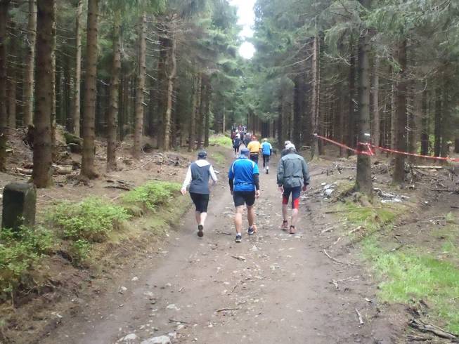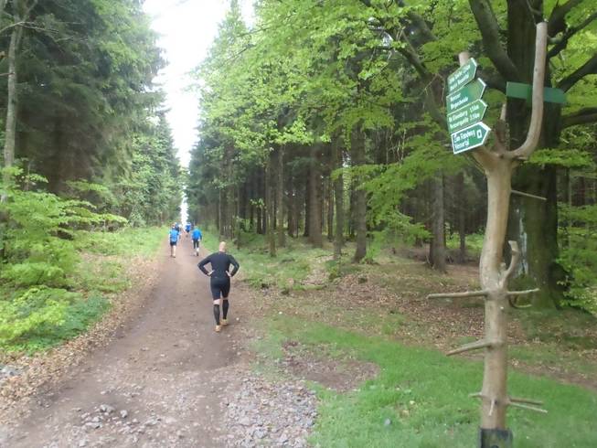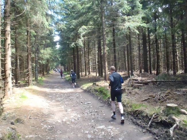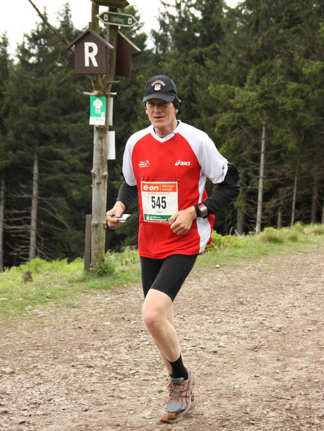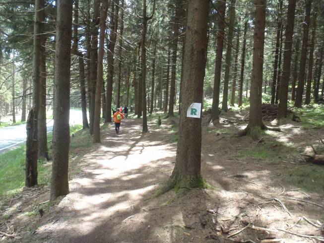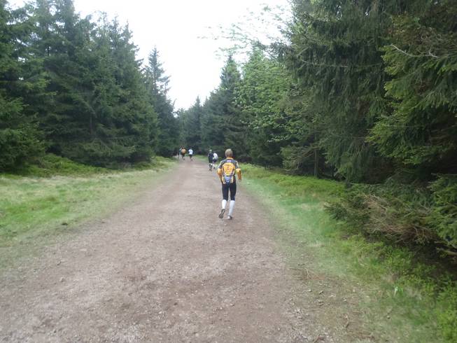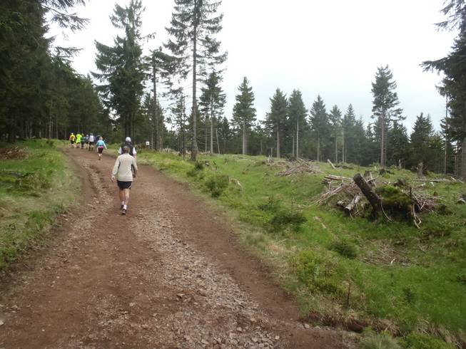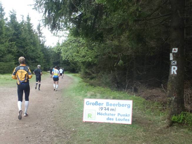 13.20 Uhr / Km 61,0 Aufstieg zum Großen Beer-baum, dem mit 982 Meter höchsten Punkt des Thüringer Waldes. Was für ein Glück, daß wir nicht ganz drüber, sondern nur knapp dran vorbei laufen mußten. Auf 974 Meter Höhe. |