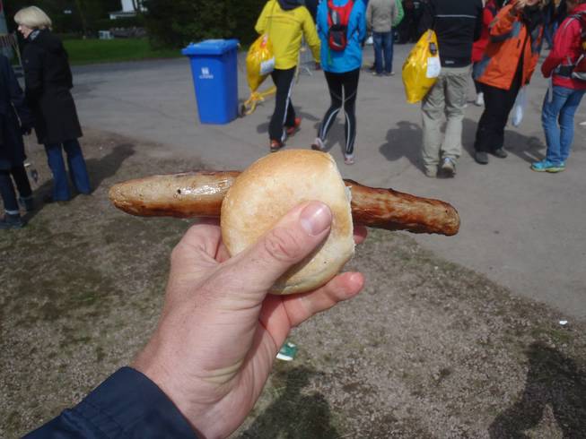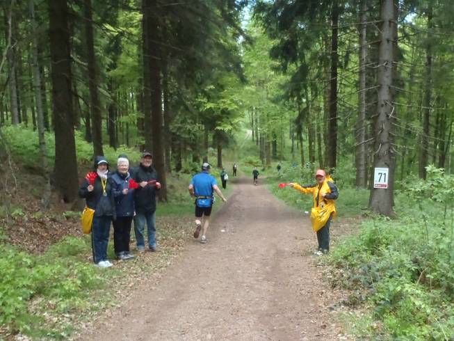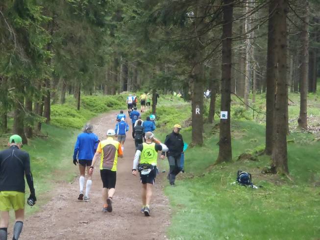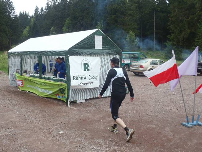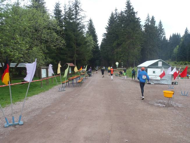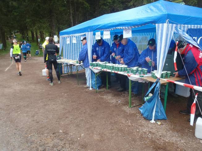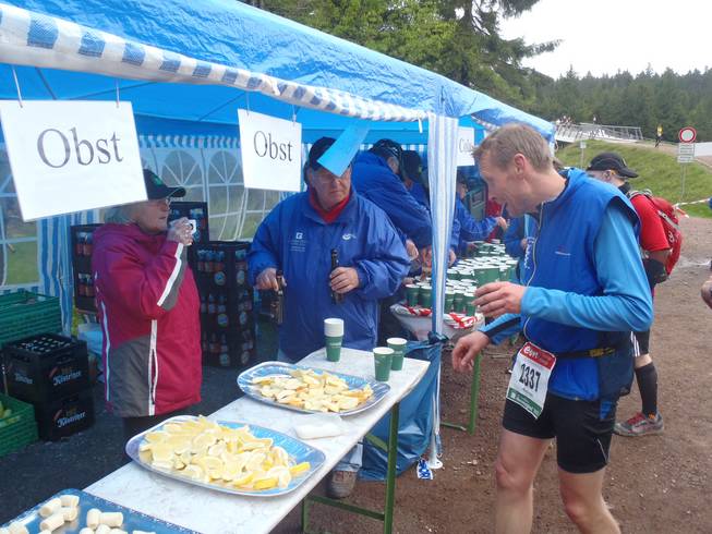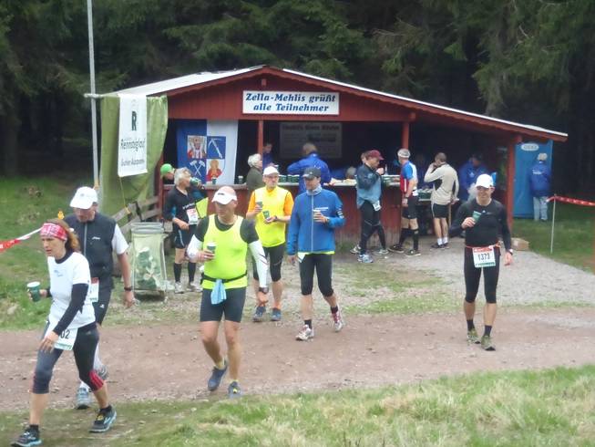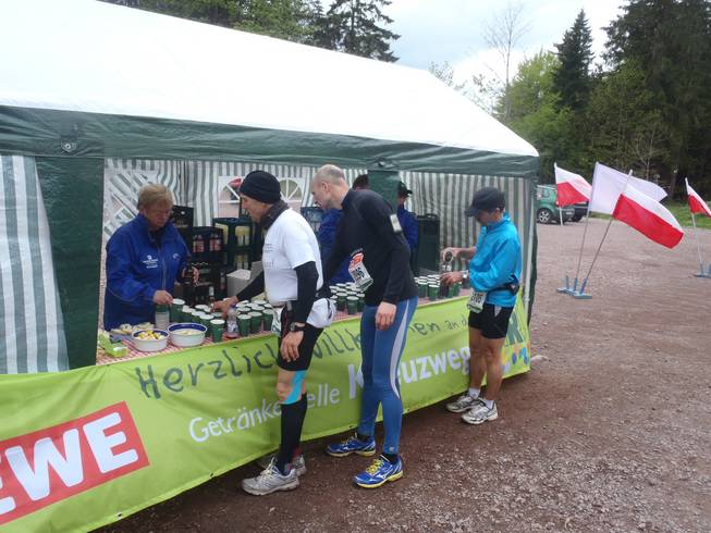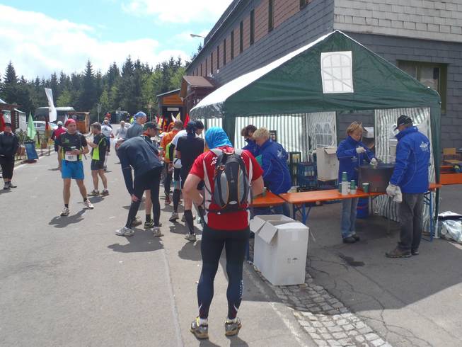 Schmücke 13.42 Uhr / Km 64,0 Hier gab es ganz normalen Haferschleim. Der war doch deutlich zähflüssiger als die Himbeer-Schleim-Suppe bei Km 37,6. Aber auch hier galt das Motto: Einfach alles durchprobieren. |