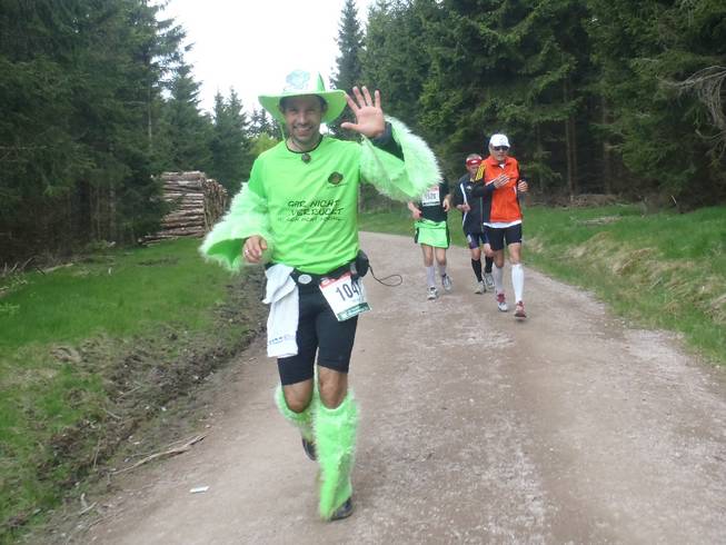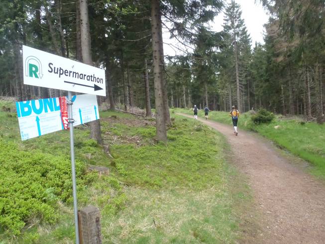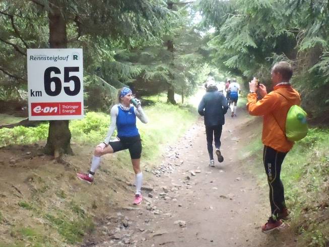 13.55 Uhr / Km 66,0 Selbst auf dem Rennsteig laufen ein ganz paar Leute in echt schrägen Outfits. |