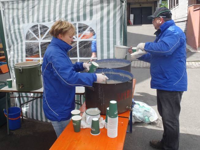 Sportplatz Schmiedefeld 15.56 Uhr Die Ausschilderungen waren etwas dürftig. Zumal die tatsächlich vorhandenen Schilder teilweise so locker baumelten, daß man ihnen nicht so recht trauen wollte. Aber nach einigem Herum-laufen fand ich auch die Gratis-Ziel-Suppe. |