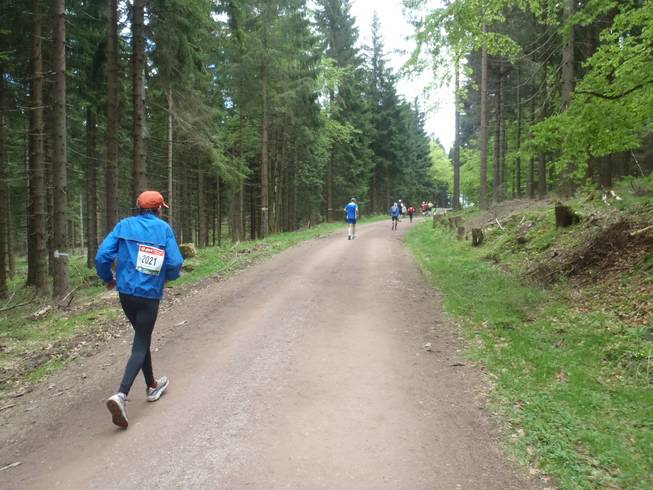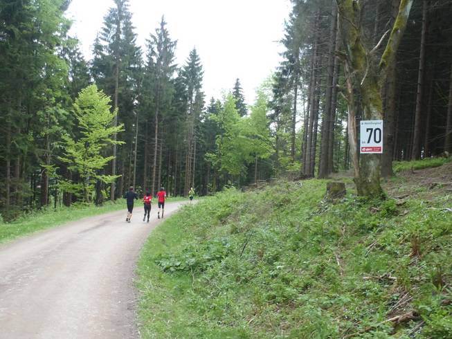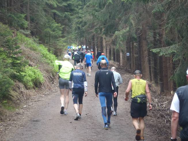 Schmiedefeld 14.30 Uhr / Km 71,4 Und noch eine Steigung. Ganz unten begann ich kurz mit Gehen. Wie gewohnt aus den achteinhalb Stunden davor. Dann dachte ich mir: "Ach, was soll's" und lief den Hügel flott hinauf. |