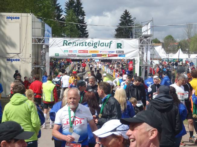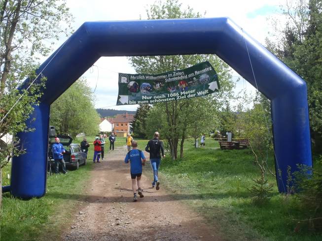 Schmiedefeld 14.32 Uhr / Km 71,614 "Nur noch 1086 Meter bis zum schönsten Ziel der Welt". Ob diese 1086 eine besondere Bedeutung hat? Sonst hätte man den Bogen doch auch 86 Meter später aufbauen können. |