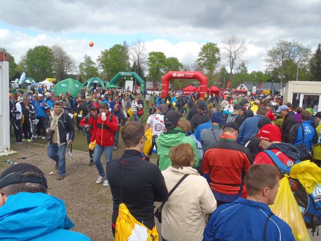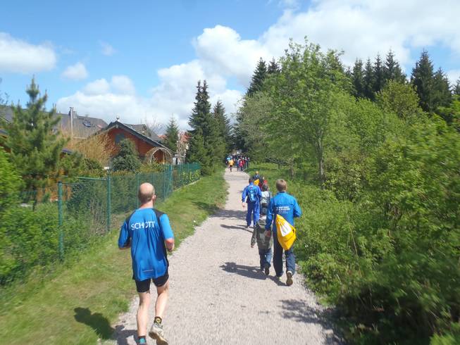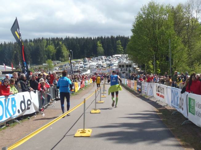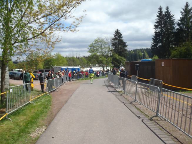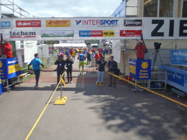 Sportplatz Schmiedefeld 14.45 Uhr Linke Seite kommen die Supermarathonies rein, auf der rechten Seite die Läufer der "kurzen" Marathon-Strecke über 43,5 KM. |