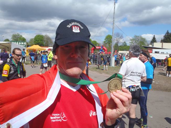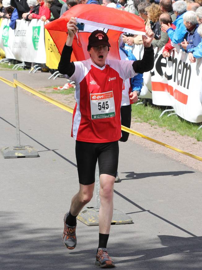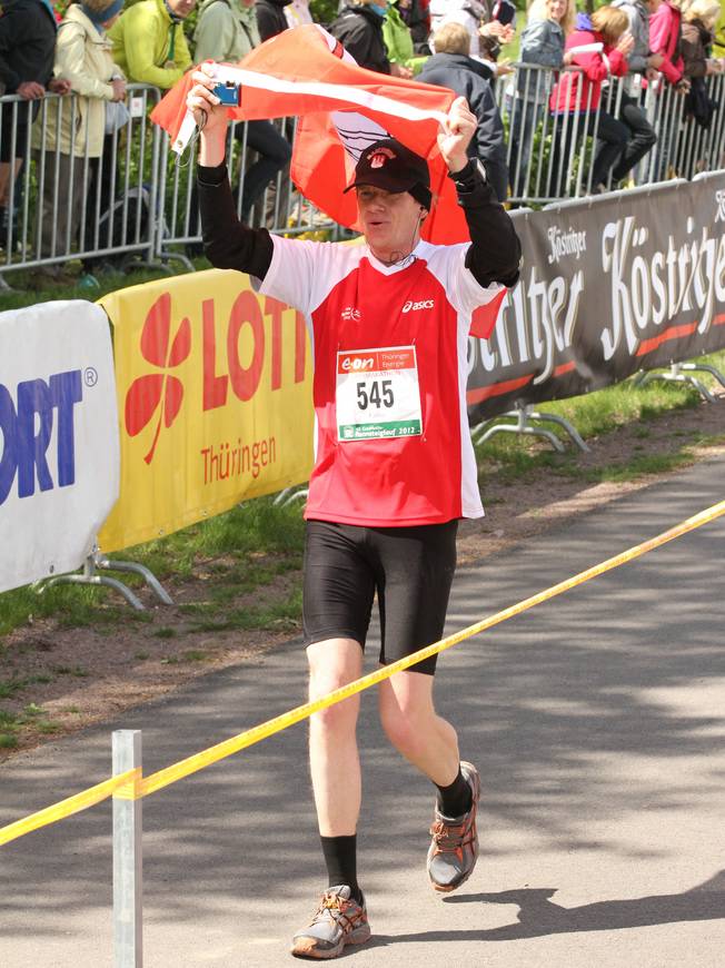 Schmiedefeld 14.33 Uhr / Km 71,8 Das klingt jetzt sicherlich dumm, aber dieser letzte Kilometer zog sich endlos dahin. Wohl auch, weil ich nun tatsächlich erstmals ganz alleine lief. Weit und breit kein Mitläufer in Sicht. Ich packte meine Hamburg-Fahne aus, die ich über die ganze Strecke in einer Tasche am Gürtel getragen hatte und deren Gewicht mich immer hat ans Ziel denken lassen. Neben der gute gewählten Musik die beste Lauf-Hilfe des Tages. |