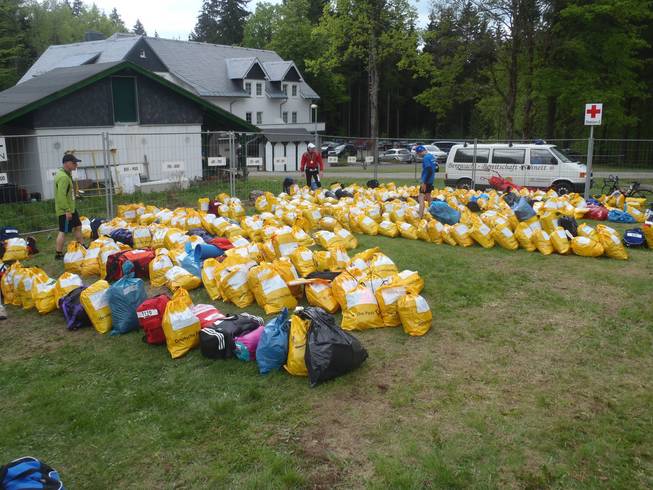 Sportplatz Schmiedefeld 14.52 Uhr Leicht torkelnd schaffte ich den Weg über den Spielplatz zu den Kleiderbeuteln. Kein Wetterschutz, Bewachung auch nicht. |