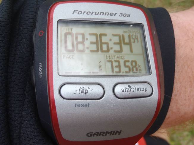 Sportplatz Schmiedefeld 14.54 Uhr So was hatte ich auf meiner Uhr noch nie gesehen. Und meine Uhr auch nicht. Ganz seltsame Zahlen. Die Distanz war bis Km 65 übrigens noch fast identisch. |