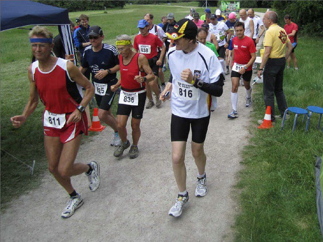 11.00 Uhr / Runde 1 Km 0,01 Und los ging es. Die Nr. 816 bin ich. Deutschland hatte am Vorabend bei der Fußball-EM im Viertelfinale Griechenland mit 4:2 geschlagen. Da konnte ich (noch) mit Stolz im Trikot laufen. (Foto: Hans-Jürgen) |