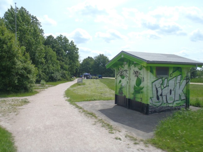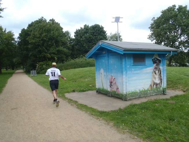 12.10 Uhr / Runde 5 Km 13,0 Dieses bunte Häuschen beherbergt eine der zwei öffentlichen Toiletten an der Eichbaumsee-Runde. Zwei Toiletten auf 2,65 Km!! Da sollten sich die Behörden an der Außenalster mal ein Beispiel nehmen. Da stehen auf 7,36 Km genau NULL Toiletten. |