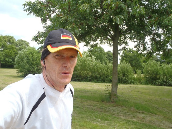 12.38 Uhr / Runde 7 Km 19,0 Ich hatte als Hörbuch ein paar Fußball-Anekdoten und als Musik zwischen-durch Fußball-Lieder. Das paßte zum Outfit. So spulte ich die Runden ab. Und irgendwann überholte ich auch Platz 5, ohne es zu merken. |