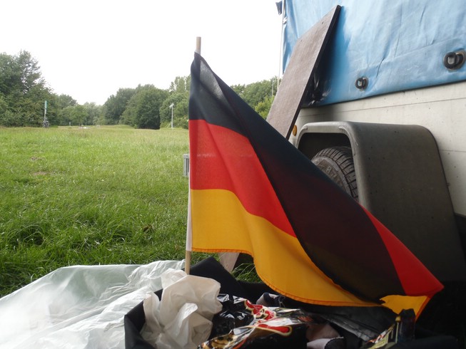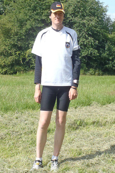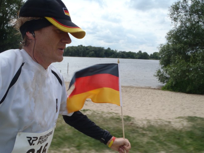 14.41 Uhr / Runde 16 Km 41,5 Genau genommen war ich mir schon vor der letzten Runde meines Platzes sicher. Darum schnappte ich mir für die Final-Runde die Deutschland-Fahne. Passend zum Outfit. Und am Trikot kann man gut erkennen, wie schwer es doch ist, beim Laufen etwas unfallfrei zu trinken. |