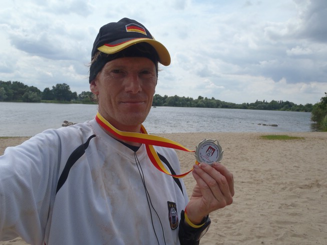 14.45 Uhr / Runde 16 Km 42,195 Naja... ganz offiziell sind es 42,4 Kilometer. Aber egal. 3:45:41 Stunden. Platz Zwei von 31 Finishern. Gleich-zeitig Platz Eins in meiner Altersklasse M40 (von 5). (Foto: Hans-Jürgen) |