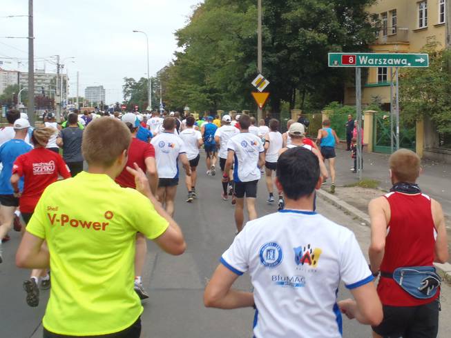Aleja Ludomira Róźyckiego 9.08 Uhr / Km 1,4 Für die ersten beiden Kilo-meter brauchte ich fast 12 Minuten. Mehr und mehr wurde mir klar, wie schwer man mit einer Widmung auf dem Rücken normal laufen kann. Das wiegt, das spürt man. Die mal aufmunternden und mal bedauernden Blicke der Mitläufer inklusive. Nach rechts nun die alte Straße 8 nach Warszawa (Warschau). |