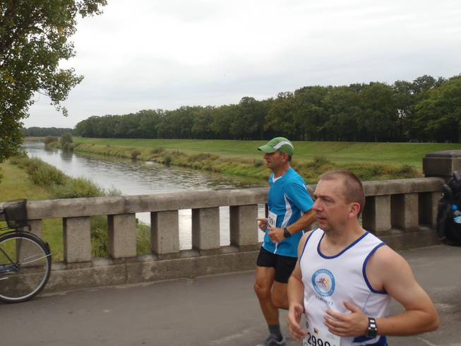 Pilczycka 10.29 Uhr / Km 16,5 Nun überquerten wir den kleinen Fluß Ślęza. Da dem kann man auch sehr schön laufen, was ich im Sommer 2012 auch reichlich getan habe (siehe Lauffotos auf der Hauptseite). Dem Fluß immer folgend kommt man nach ein paar Kilometern am Grab der Goßmutter meiner Tochter vorbei, dem ich diesen Lauf je widmete. |