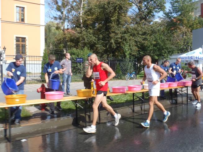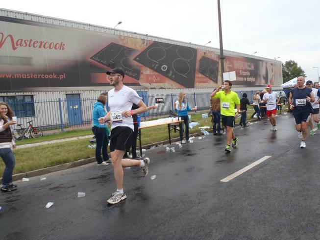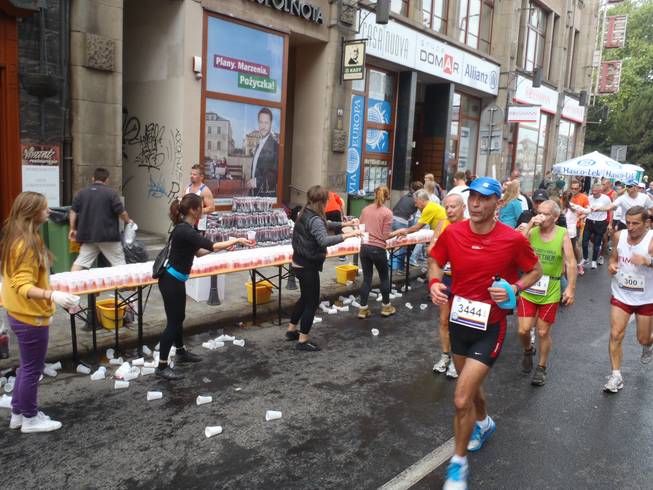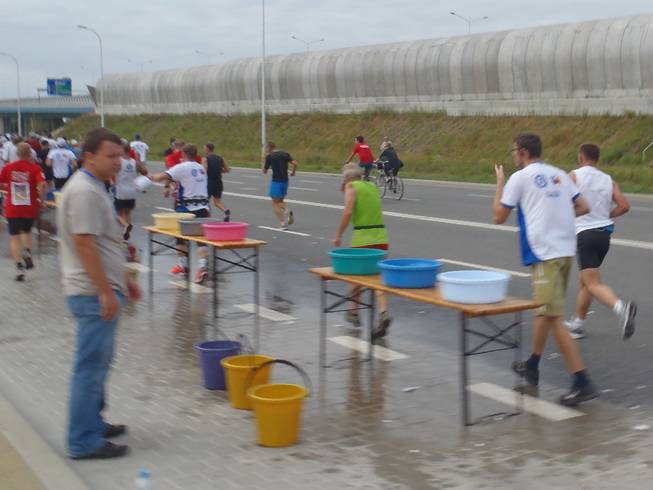 Aleja Tadueusza Boya-Żeleńskiego 9.26 Uhr / Km 4,5 Die erste von insgesamt 15 Verpflegungsstellen. Also ab hier ziemlich genau alle 2,5 Km eine. Wasser und Iso satt und später dann auch lecker Obst. |