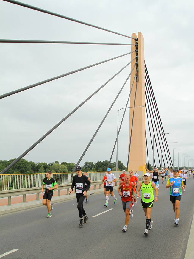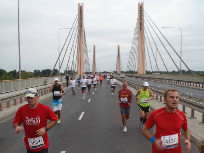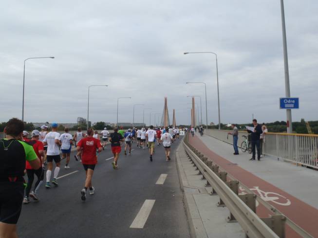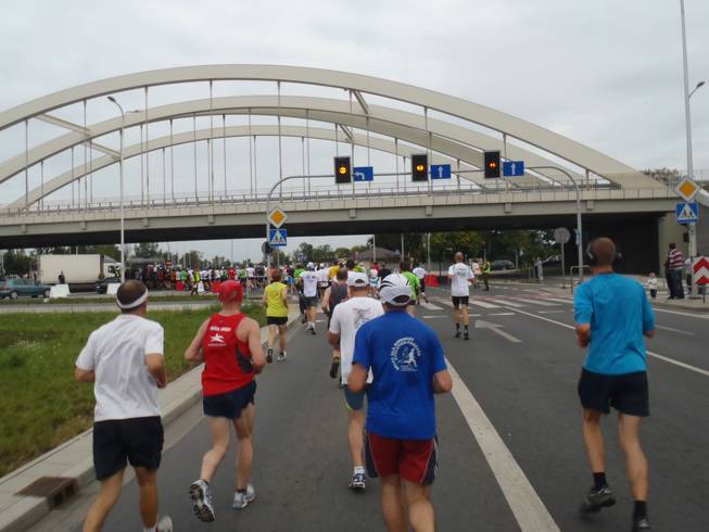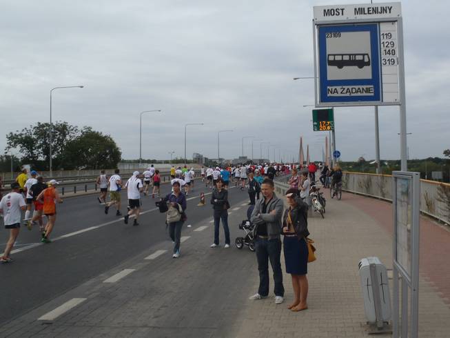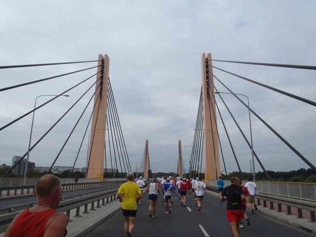 Lotniccza / Plac Solidarności 11.12 Uhr / Km 24,5 Über diese Brücke bin ich auch schon mehrfach im Training gelaufen. In früheren Jahren. |