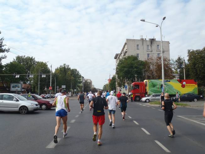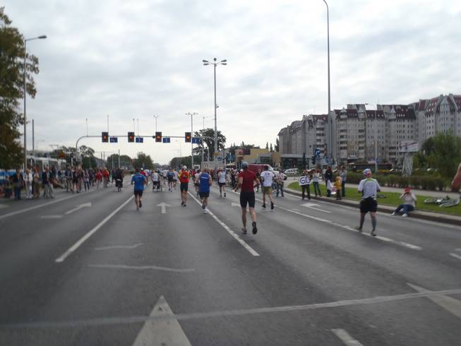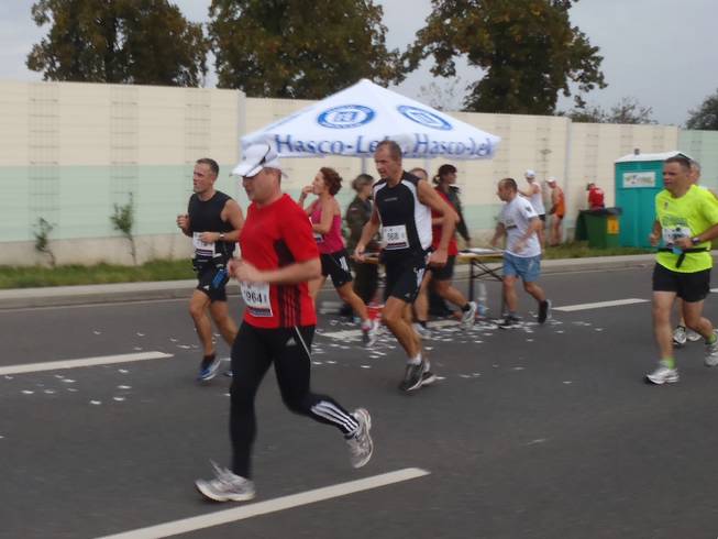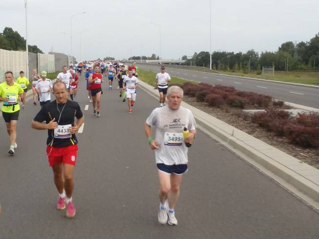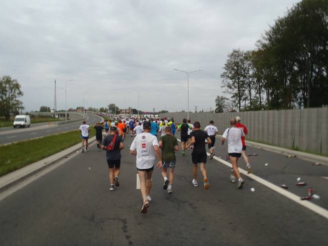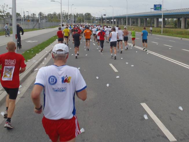 Lotniccza 10.53 Uhr / Km 21,1 1:53:12 Stunden war meine offizielle Zeit hier beim Halbmarathon. Also war eine Zeit unter 3:50 Stunden durchaus möglich. Allerdings war mir auch klar, daß die zweite Hälfte um einiges schwieriger werden würde. Foto: |