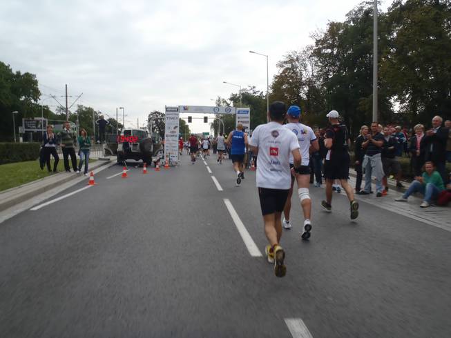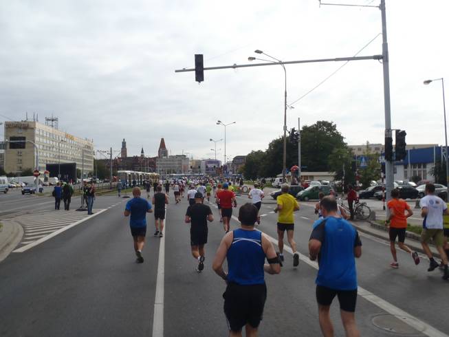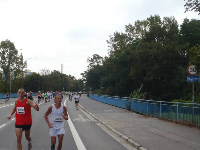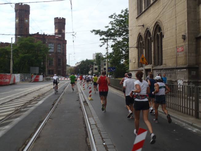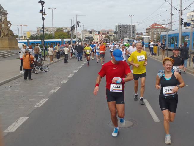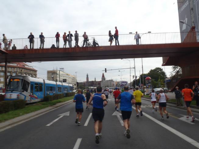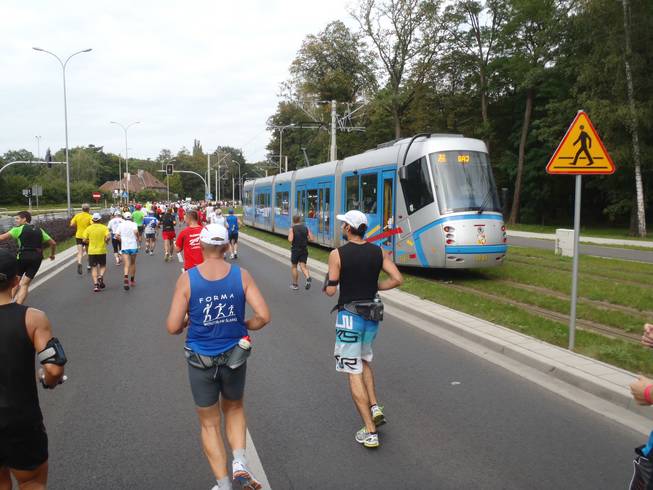 Pilczycka / Park Zachodni 10.18 Uhr / Km 14,5 Die Straßenbahnen standen an jenem Tag massenweise im Stau fest. In Wrocław gibt es kein Verkehrssystem während des Marathons. Ein paar Durchlässe oder Schleusen hätten das Problem etwas kleiner halten können. Da kann man ja noch nachbessern. |