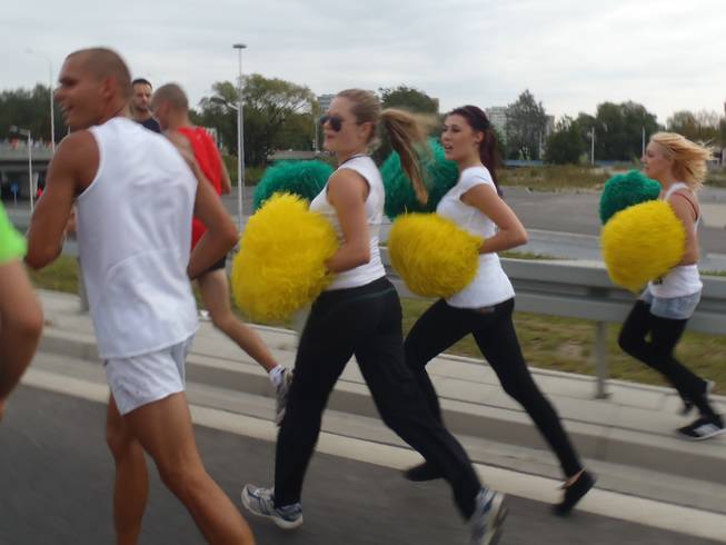 Waicińska 10.40 Uhr / Km 18,5 Die drei Cheerleader hier waren nicht hinter mir her, sondern hinter den beiden Läufern in Rot und Weiß. Sehr lange konnten sie das Tempo aber nicht halten. |