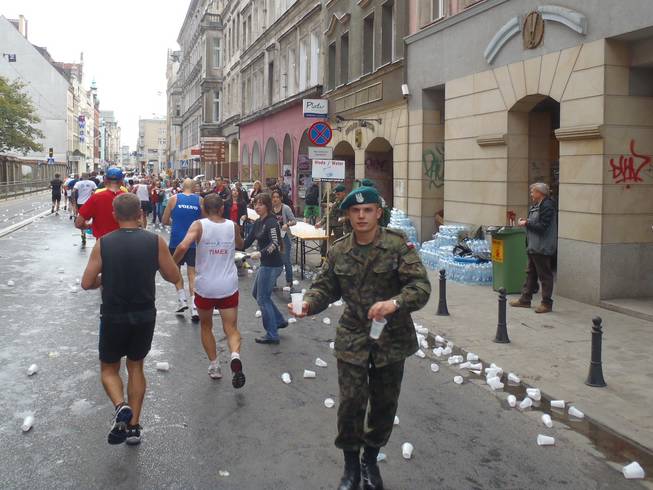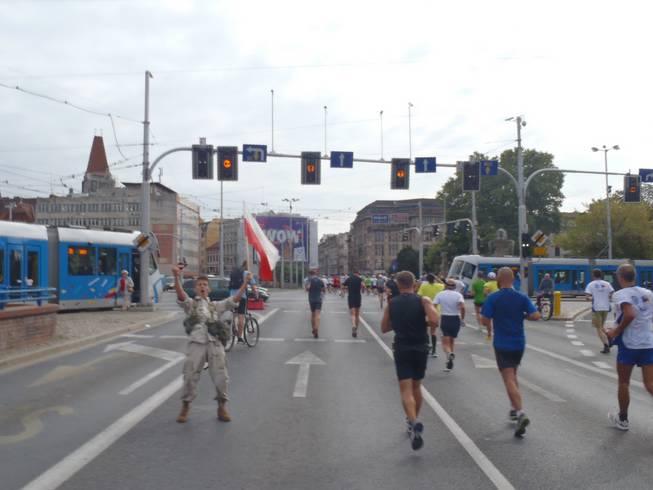 Ruska 11.15 Uhr / Km 25,0 Der Wrocław-Marathon ist auch die polnische Militär-Marathon-Meisterschaft. Entsprechend viel Militär war dann auch als Helfer im Einsatz. Angesichts meiner gewissen Angst vor dem einen oder anderen Zuschauer eine durchaus beruhigende Tatsache. |