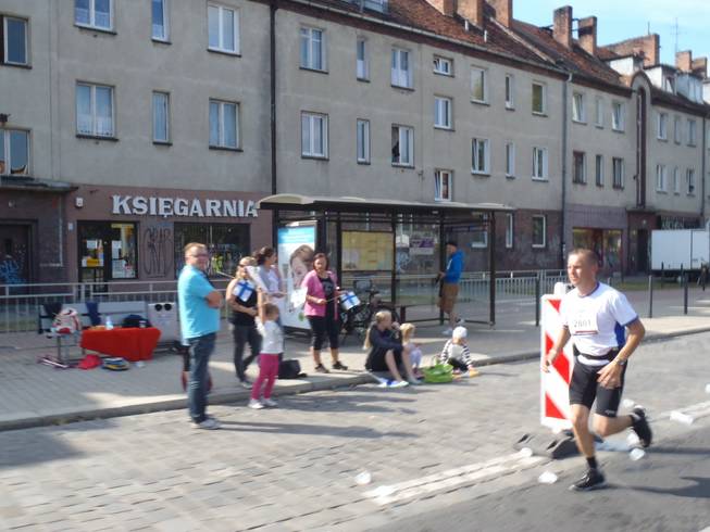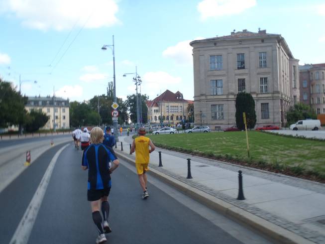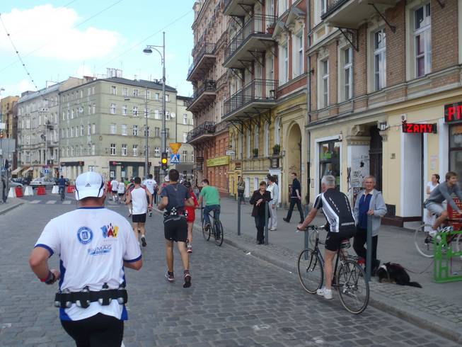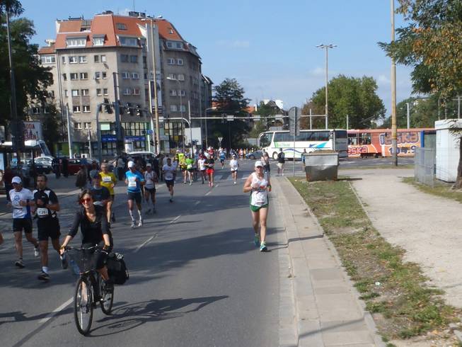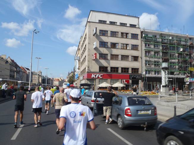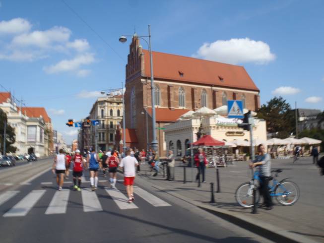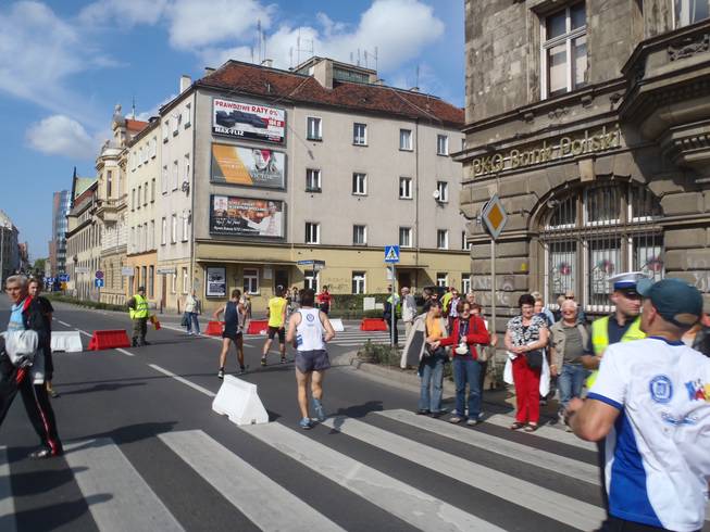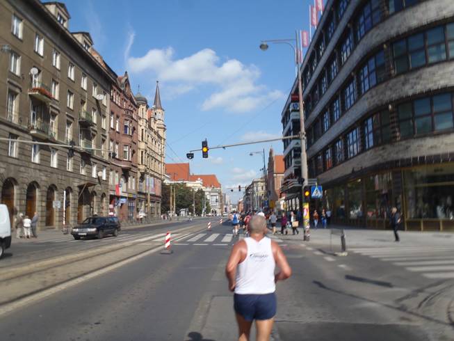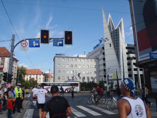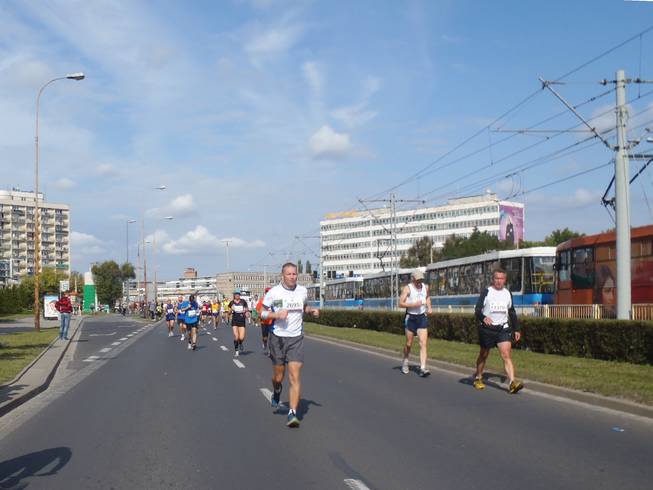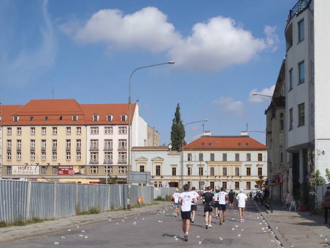 Borowska 12.07 Uhr / Km 34,8 Rechts vom Bild ist der Bus-bahnhof von Wrocław. Es gibt kaum vergleichbares zu einer Nachtfahrt Hamburg-Wrocław in einem engen polnischen Bus, um dann gegen 4.00 Uhr früh hier anzukommen. Zum Marathon kam ich da lieber mit dem Zug... |
