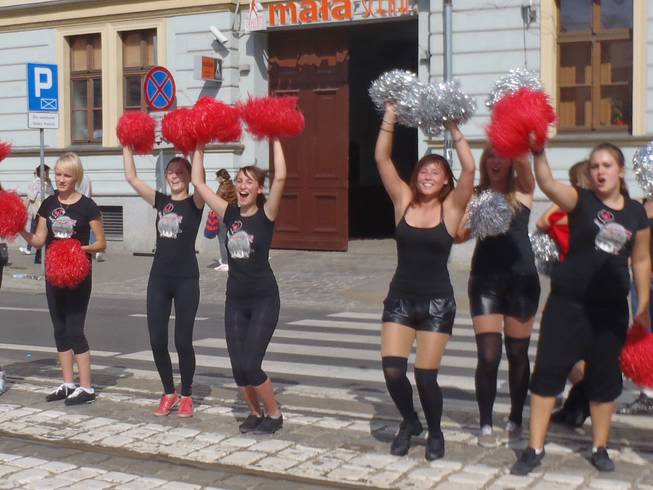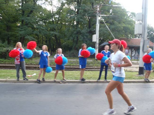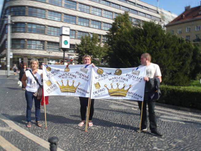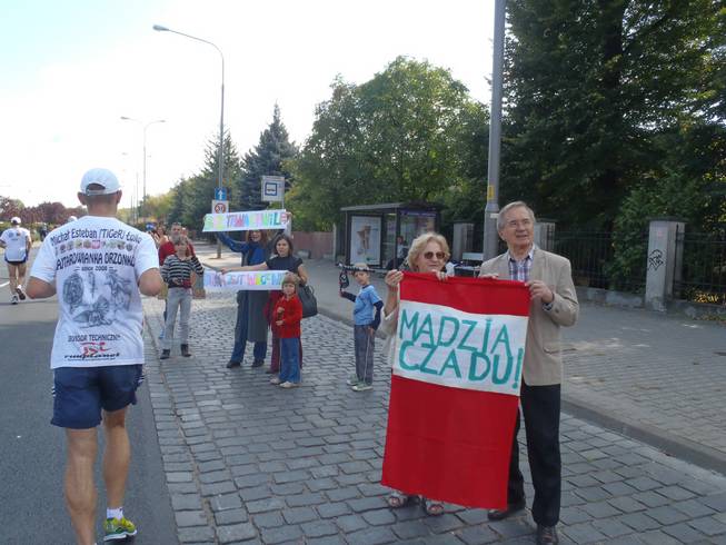 Pilsudskiego 12.10 Uhr / Km 35,3 Nette Anfeuerung. Von diesen Gruppen gab es einige entlang der Strecke. Das war Teil eines Wettbewerbes um den Preis "beste Doping" (offizieller Text Deutsche Ausschreibung). Gemeint war "bestes Jubeln" und dann hatten die Ausrichter den Google-Translator genutzt. Nach dem Marathon wurde der lustige Fehler aber dann korrigiert. Also keine Preise fürs Dopen. Auch nicht im Osten Europas. |