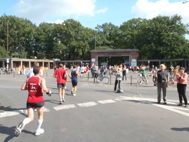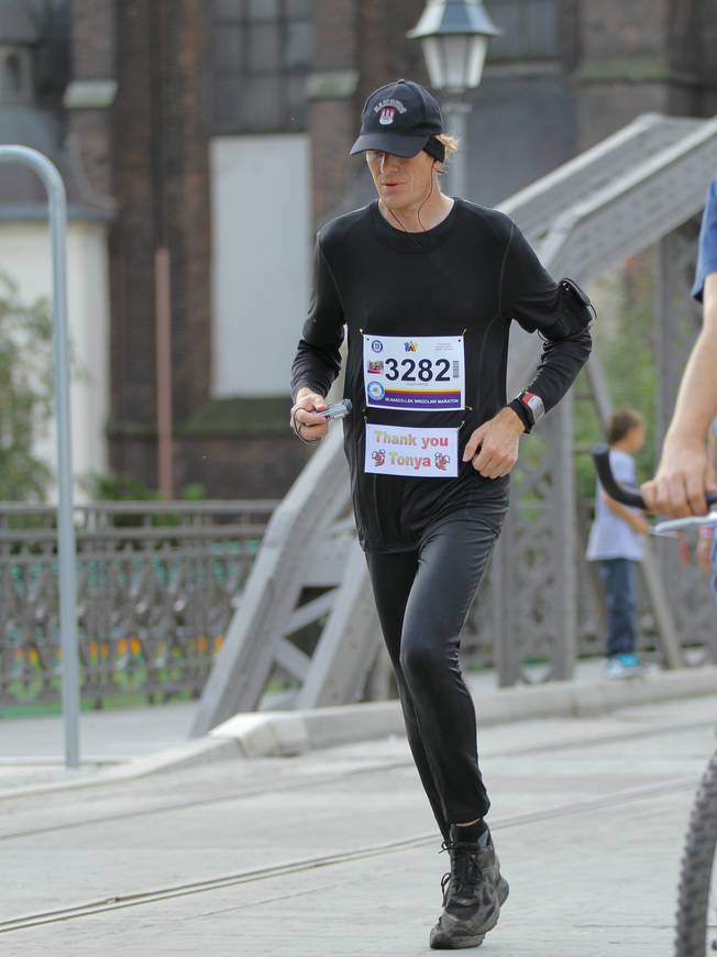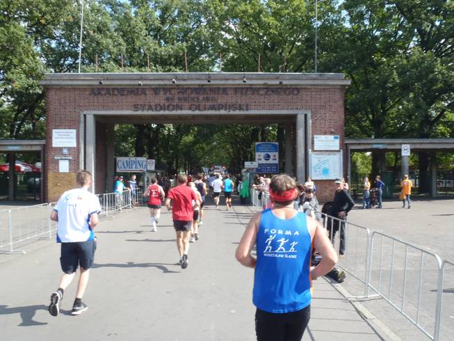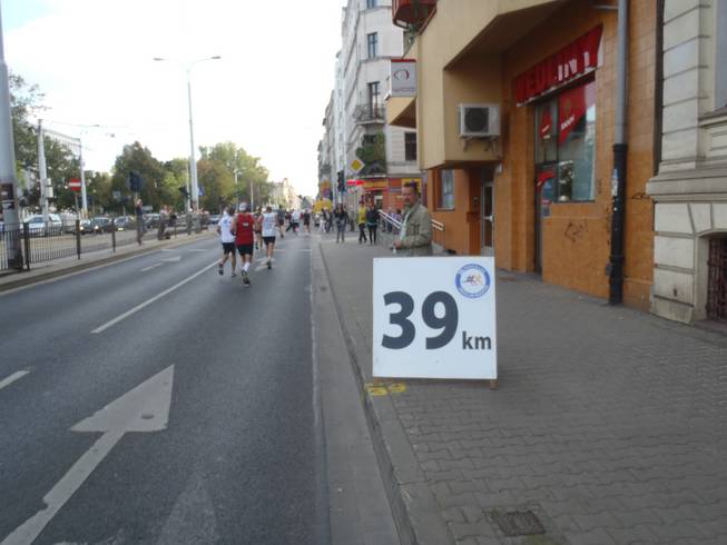 Wrocław Stadion Olimpijski 12.46 Uhr / Km 42,0 Am rechten Rand war kurz vor dem Ziel noch ein Läufer zusammenbrach. Ich konnte aus der Entfernung sehen, wie er plötzlich in die Seitenbande torkelte und zu Boden ging. Die Rettungs-kräfte waren bald da und am Ende kam er auch noch ins Ziel. Aber schön anzusehen war das nicht. |