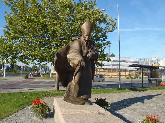 Papst Johannes Paul II. auf der Rückseite der Kościół Św. Maksymiliana Marii Kolbego |
