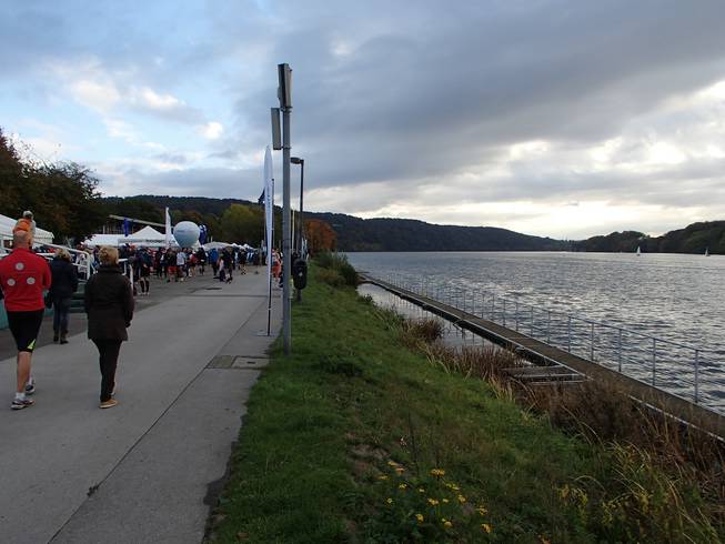 Baldeneysee 9.33 Uhr Als ich dann umgezogen war, fröstelte es mich doch sehr. Und noch 26 Minuten bis zum Start. Vielleicht hätte ich doch lieber mehr anziehen sollen. |