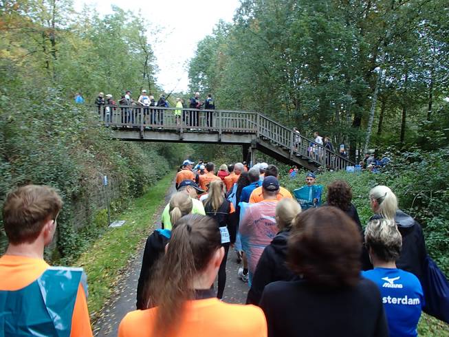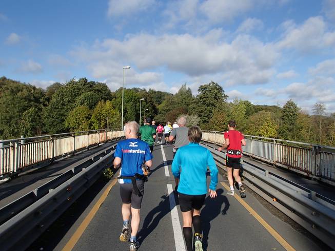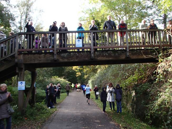 Kampmannbrücke 11.04 Uhr / Km 11,2 Sieht aus wie eine große Zuschauermenge, ist aber der erste Wechselplatz für den Staffel-Marathon. |