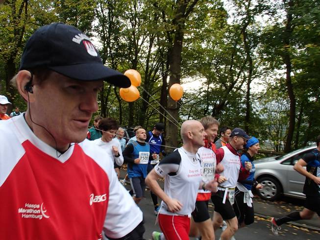 Freiherr-von-Stein-Straße 10.05 Uhr / Km 0,7 Die 3:59er-Ballonläufer fingen reichlich schnell an. Schon nach der ersten Steigung setzten sie zum Überholen an. Es sollte bis Kilometer 3 dauern, bis ich endlich deren Atem nicht mehr im Nacken hatte. |