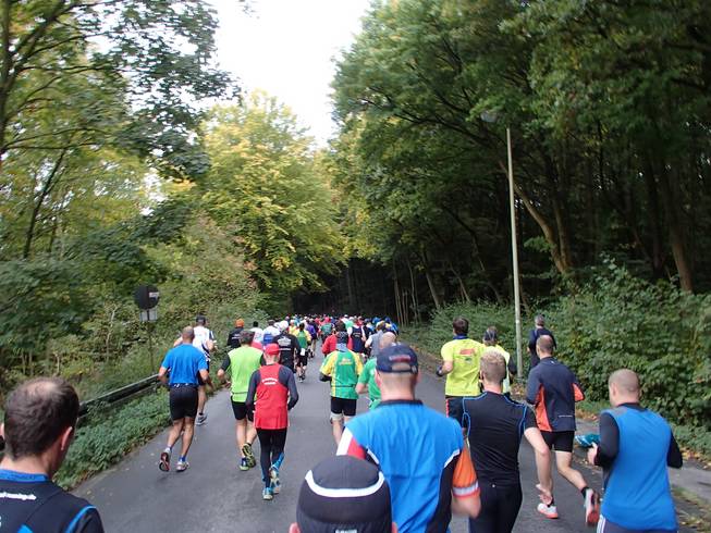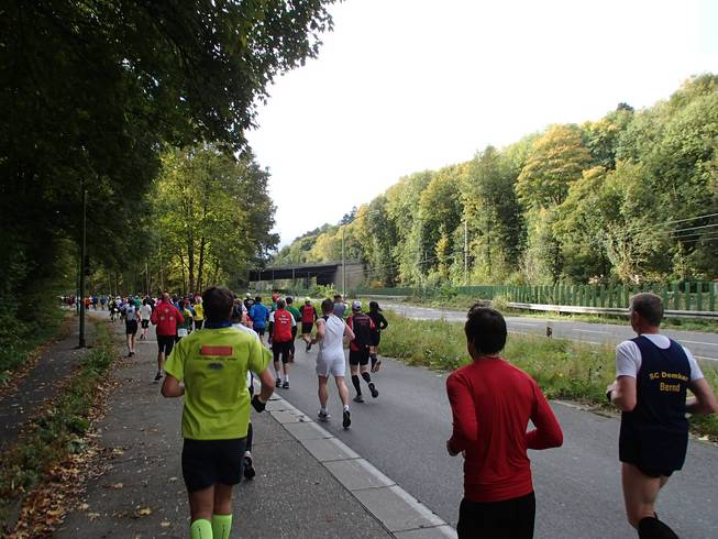 Wuppertaler Straße 11.16 Uhr / Km 13,5 Auf der Gegenseite kamen schon Läufer bei Km 16,5 entgegen. Da würde ich in 16 bis 17 Minuten auch sein. |