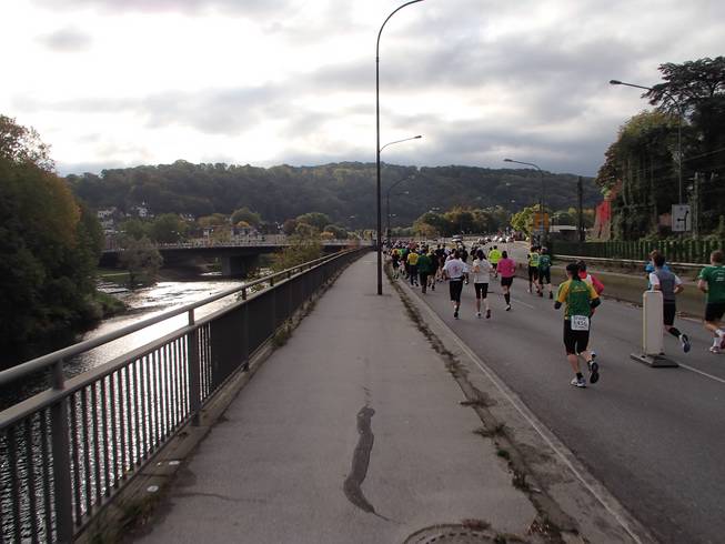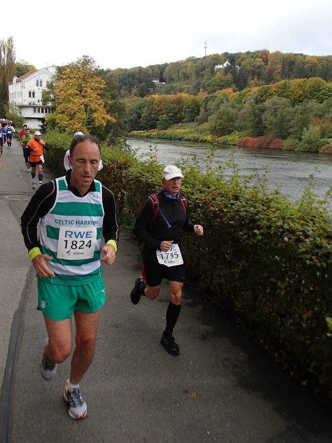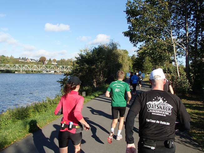 Heckstraße 10.25 Uhr / Km 4,0 Nun liefen wir endlich auch mal am Wasser. Allerdings war das nicht der Baldeney-see, sondern schon wieder die Ruhr. Der Staudamm sollte erst noch kommen. |