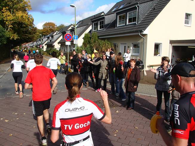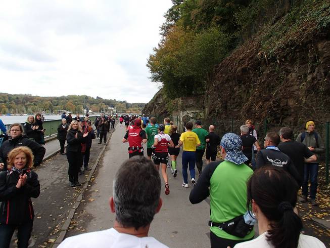 Landfermannfähre 11.52 Uhr / Km 20,5 Und dann endlich auch einmal richtig Zuschauer. Hier in Essen-Heisingen standen sie schön kompakt an der Strecke und machten super Stimmung. |