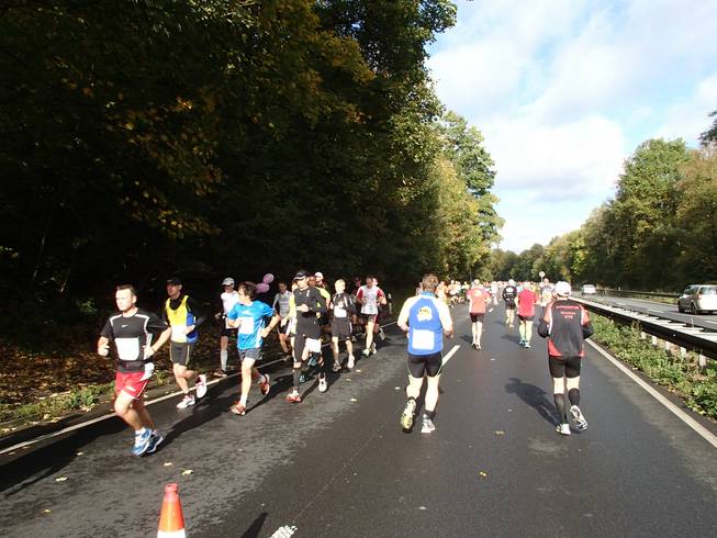 Hardenbergufer 10.28 Uhr / Km 4,8 Nach einer kurzen Pinkel-pause hinter Km 5 hatten mich die 3:59er-Ballons wieder eingeholt. Ich kam gerade noch in letzter Sekunde vor ihnen auf die Strecke zurück. Allmählich wurden sie lästig. |