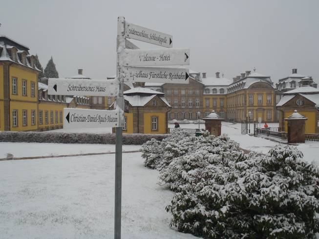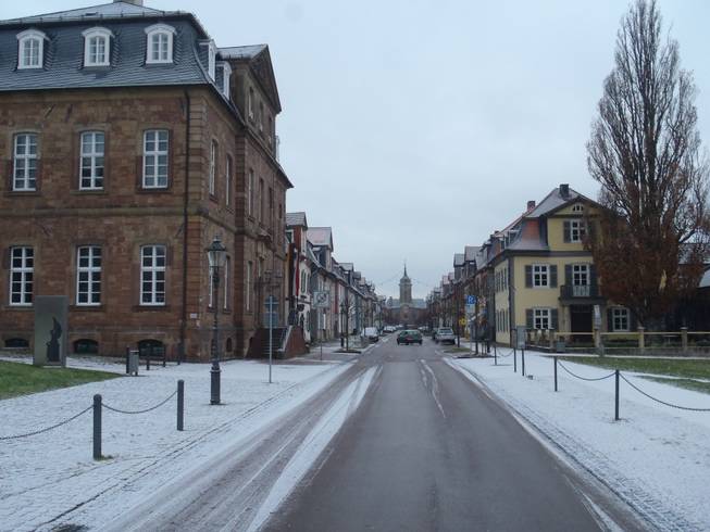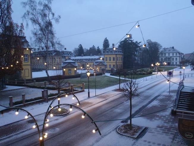 Schloßstraße / Residenzschloß Arolsen 8.59 Uhr Der Tag fing ja gut an. Leichter Schnee über und auf Bad Arolsen. |