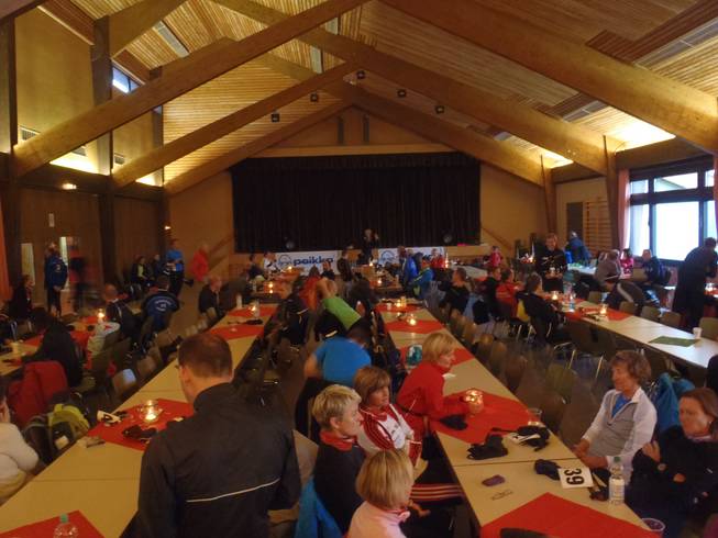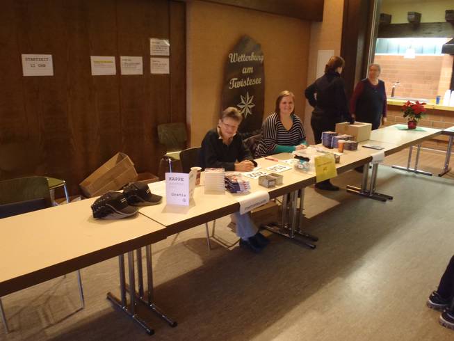 Twistesee-Halle, Wetterburg Zusammen mit der Start-nummer gab es einen Adventskalender (lecker Schokolade, ein Türchen durfte man ja gleich aufmachen) und ein Cappy vom Vorjahreslauf. An der Wand der große Hinweis auf die Startzeit 11.00 Uhr. Eine lokale Zeitung hatte am Vortag nämlich 12.00 Uhr geschrieben. |
