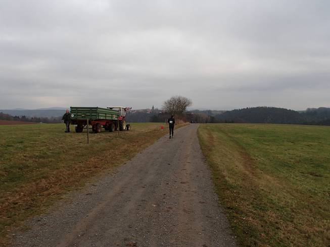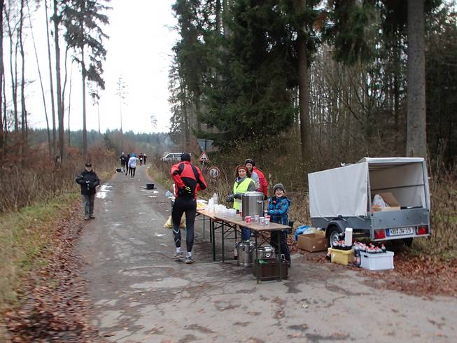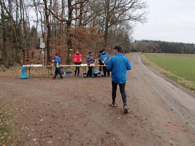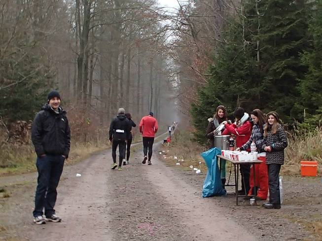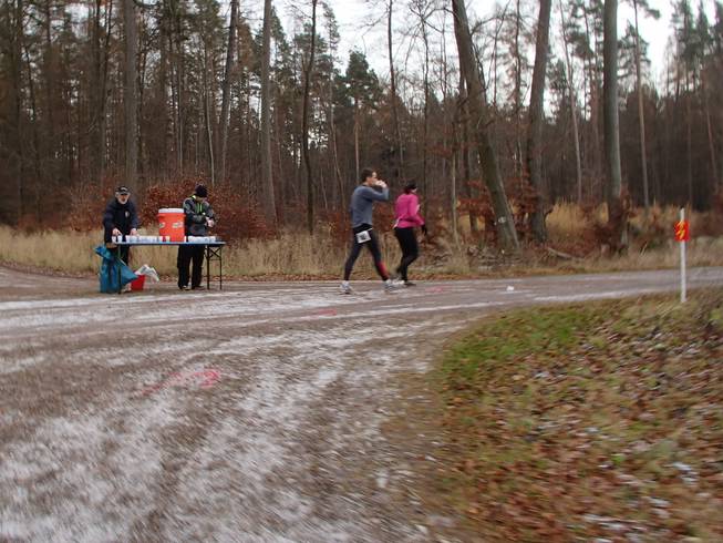 Wetterholz / Heidekreuz 11.39 Uhr / Km 7,0 Als der Veranstalter vor dem Lauf in der Twistesee-Halle von extrem kalt und windig sprach, meinte er die Strecke zwischen Km 7 und 11, wo es vier Kilometer lang gegen den Wind gehen sollte, zwei davon über freies Feld. Zum Aufwärmen gab es hier heißen Tee. Aber richtig heiß. |