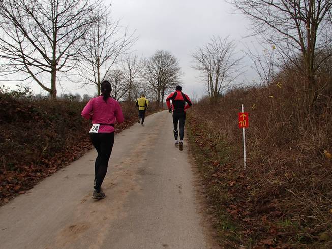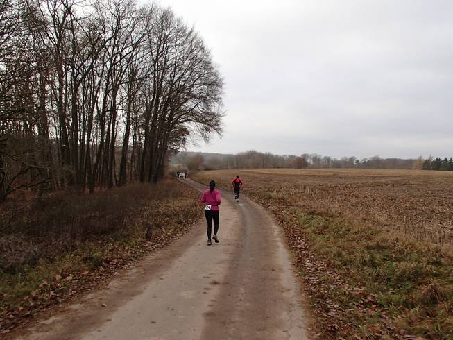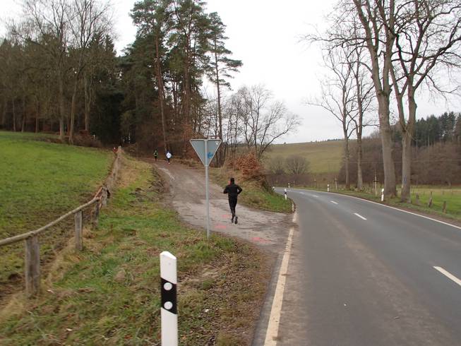 Wilhelm-Kaiser-Weg 12.58 Uhr / Km 21,3 Nun ging es in den Süden des Kurses. 500 Meter gab es auch Gegenverkehr. Der Läufer links ist schon fast fünf Kilometer weiter. |