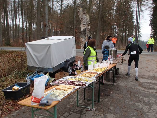 Langenwald 13.55 Uhr / Km 30,2 Verpflegung mitten im Wald. Und dann auch noch so nett dargeboten. Das brachte doch ein kurzes Lächeln zurück. |